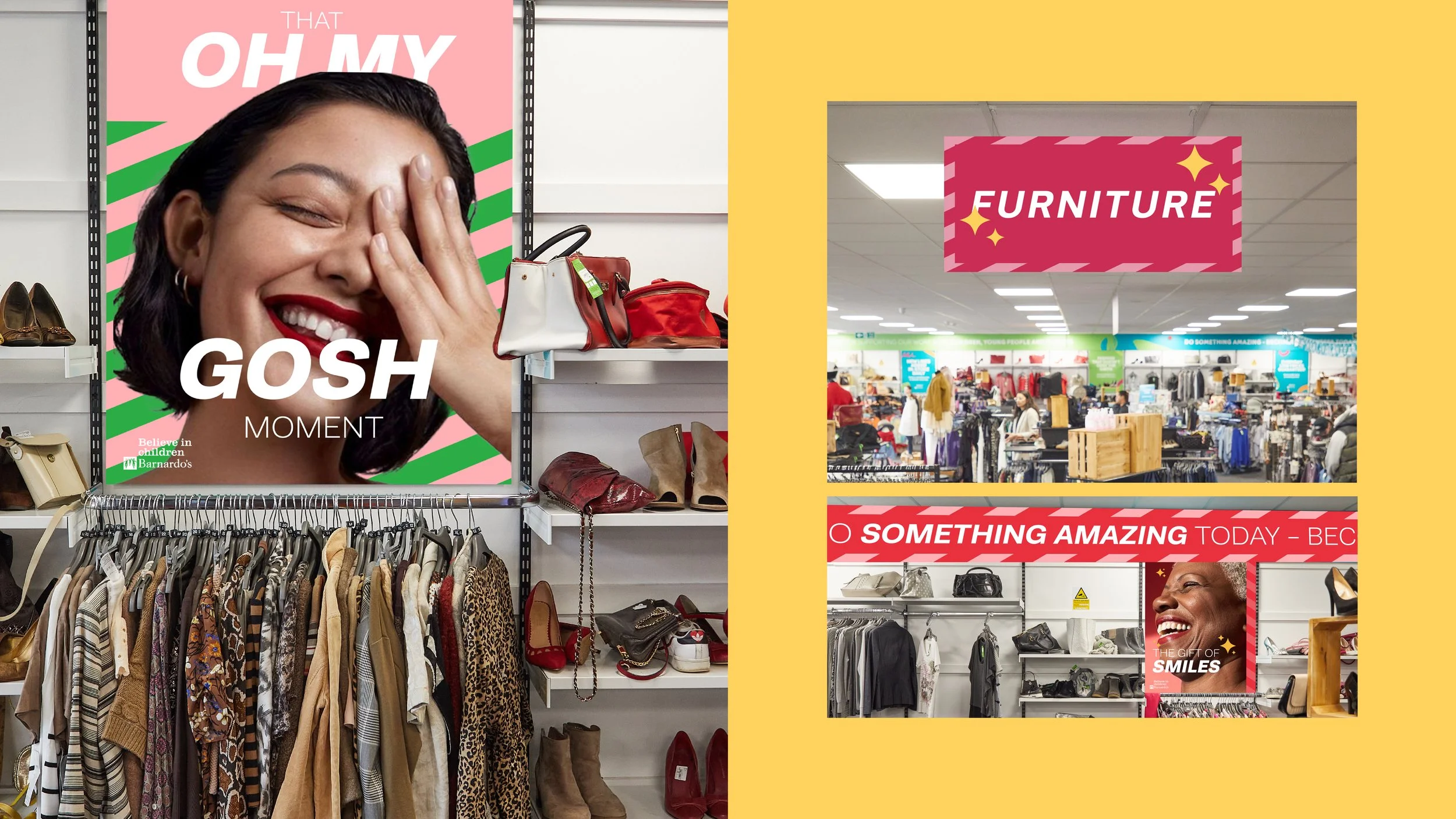 A fully integrated Christmas campaign for Barnardo’s to run across multiple touchpoints, including in-store, social media, and print. The concept needed to be uplifting and positive, capturing the warm, traditional feel-good spirit of Christmas. Given the wide-ranging audience of second-hand shops, the campaign was designed to resonate across all ages.