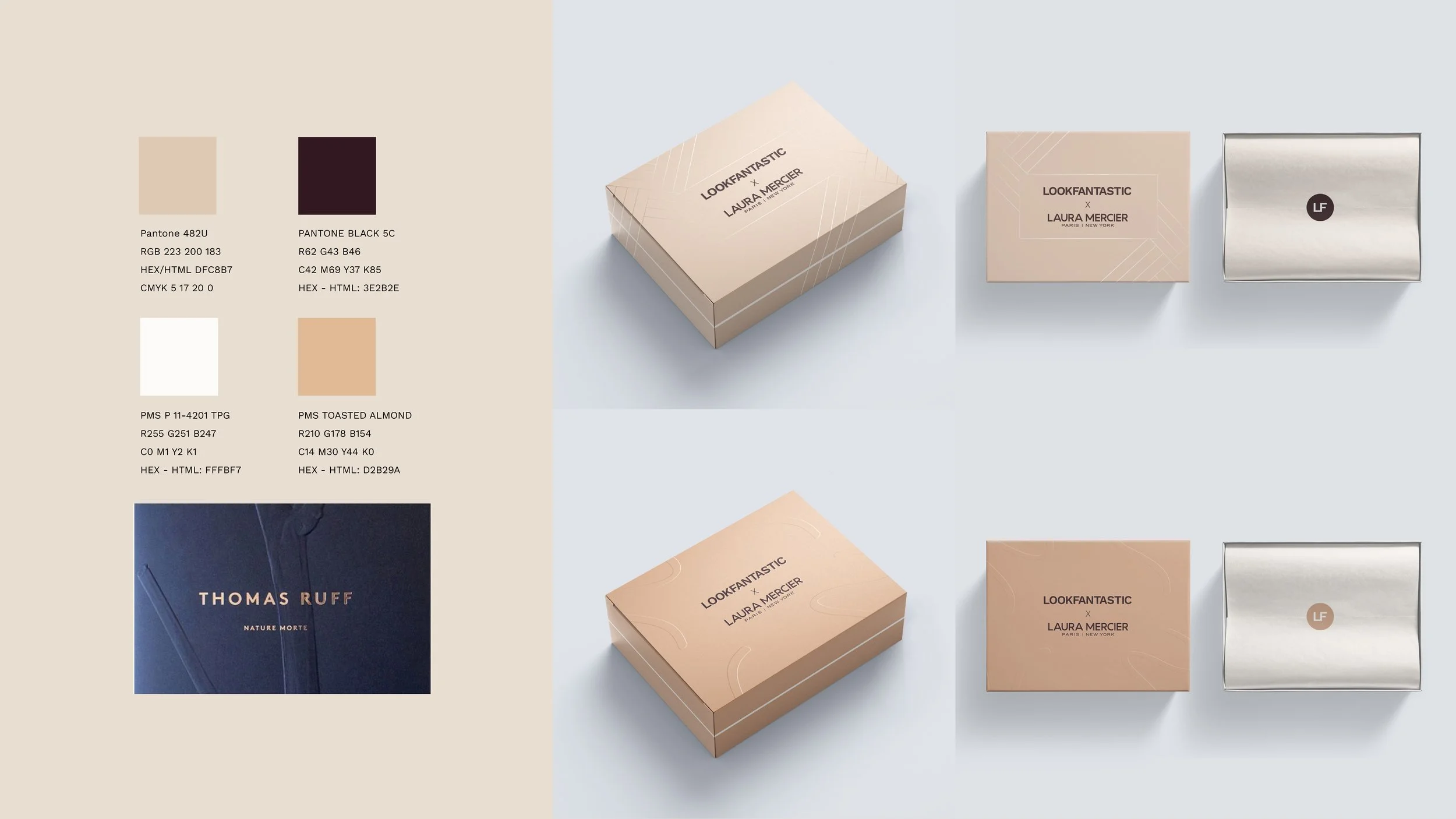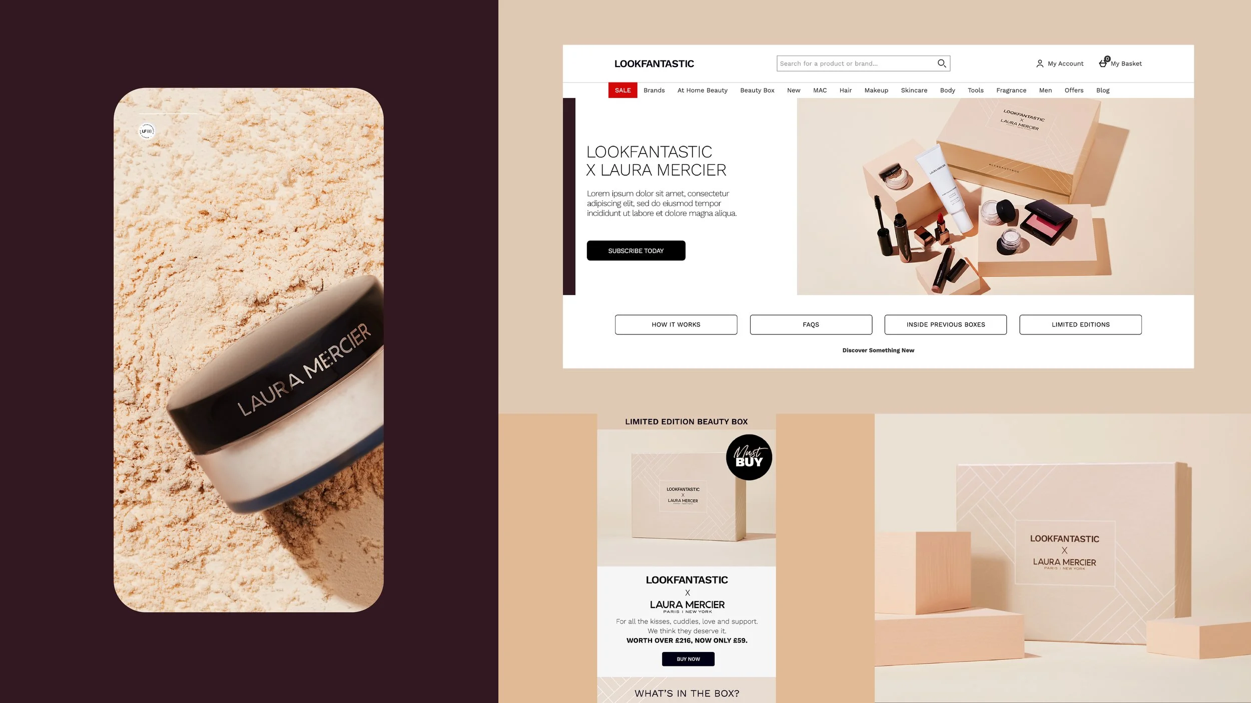 For this collaboration, I designed the packaging and developed the creative concept for the campaign shoot promoting the LOOKFANTASTIC Beauty Box in partnership with Laura Mercier. The visuals needed to feel premium while staying true to the identities of both LOOKFANTASTIC and Laura Mercier.